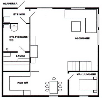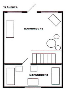 Kanerva lomamajassa on käyttöpinta-alaa terasseineen noin 100 m2, alakerta 64 ja yläkerta 36 m2.